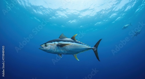 Fototapeta premium Tuna fish swimming in deep blue ocean. Sunlight rays shining through water