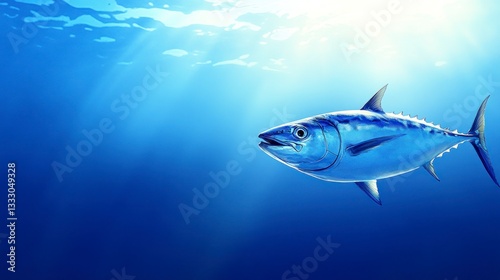 Obraz premium Tuna Fish Swimming in the Blue Ocean with Sunlight Streaming Through