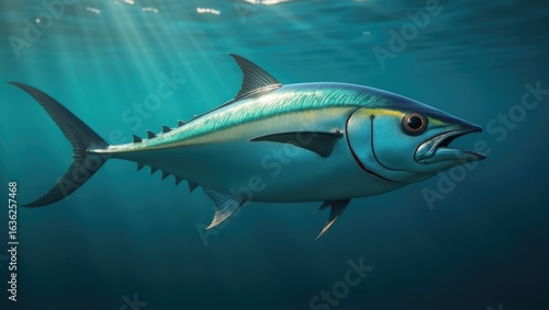 © undangan, Fototapeta premium Tuna fish swimming underwater in deep blue water.