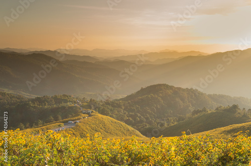 Fototapeta premium Tung Bua Tong Mexican sunflower under blue sky in Maehongson, Th