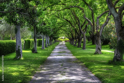 Obraz premium Tunnel-like lime tree avenue in spring, fresh green foliage. Beautiful simple AI generated image in 4K, unique.