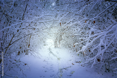 Obraz premium Tunnel path in dense forest, view on a winter day
