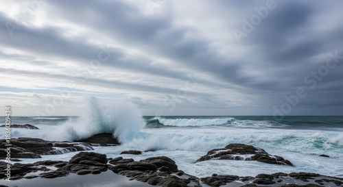 © Ariestia, Obraz premium Turbulent ocean waves crash forcefully against dark coastal rocks beneath a sweeping cloudy sky