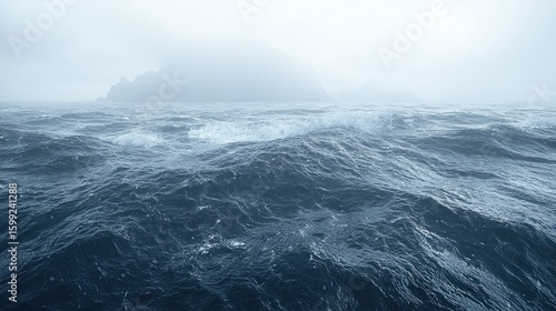 Fototapeta premium Turbulent Ocean Waves Crashing Against Distant Foggy Islands