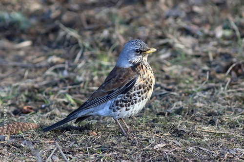 Fototapeta premium Turdus pilaris. Thrush the Fieldfare closeup in March in the South of Western...