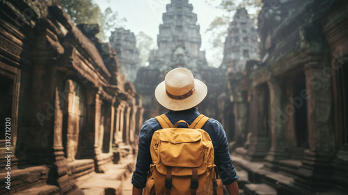© JuananSH, Fototapeta premium Turista explorador con mochila y gorro caminando entre ruinas