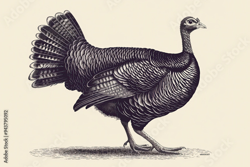 © HumanArtPixels, Obraz premium Turkey, sketch. Vintage retro print, turkey sketch ink pencil style drawing, linear drawing for Thanksgiving Day, engrave old school. Sketch artwork silhouette turkey. Side view profile. Illustration