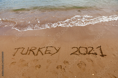 Fototapeta premium Turkey 2021. The inscription on the sand of the Turkish beach next to the waves of the sea. Holidays in Turkey in 2021.