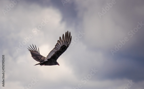 Obraz premium Turkey vulture flying gracefully under a cloudy sky with wings fully extended...