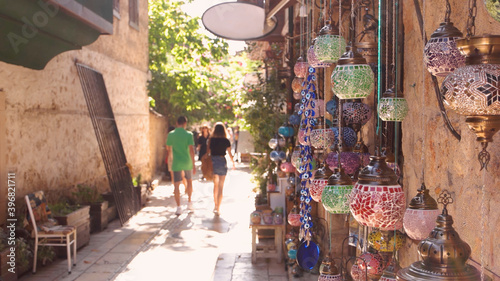 Fototapeta premium Turkish bazaar lamps hanging on the wall. Tourists walking on the street of old town Kaleici, Antalya, Turkey.