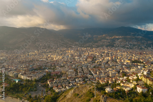 Obraz premium Turkish city view in touristic place. An aerial view of the Alanya in Antalya Turkey with cloudy sky.