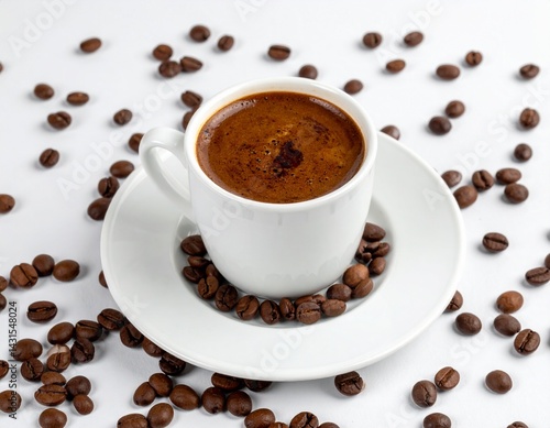 Fototapeta premium turkish coffee in a white cup with coffee beans around, white background