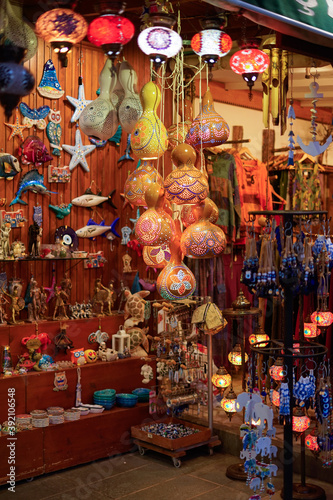 © Анна Звягинцева, Naklejka premium Turkish lanterns and lamps in the bazaaryellow lemons in green foliage
