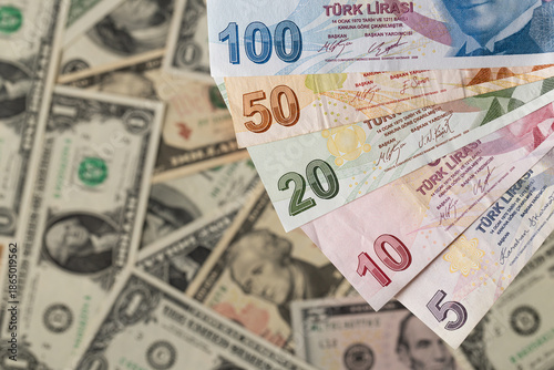Obraz premium Turkish Lira Banknotes on Dollar Background