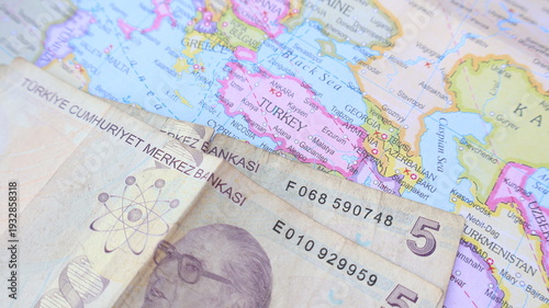 © Passionwith, Naklejka premium Turkish Lira Currency with World Map: Travel Planning