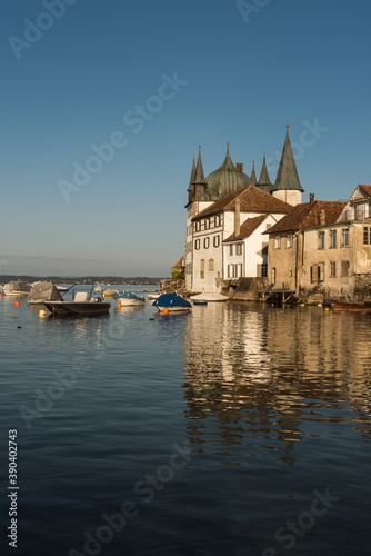 © Conny Pokorny, Fototapeta premium Turmhof mit Hafen und Booten in Steckborn am Bodensee, Kanton Thurgau, Schweiz