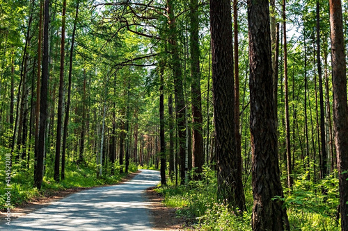© Lena_viridis, Fototapeta premium Turning asphalt road in spring summer forest in sunlight, trees with lush bright yellow green foliage