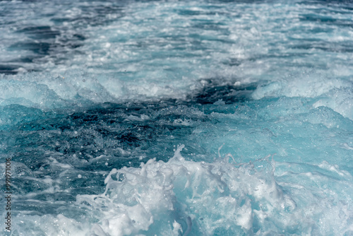 Fototapeta premium Turquoise blue ocean water foaming behind a ship