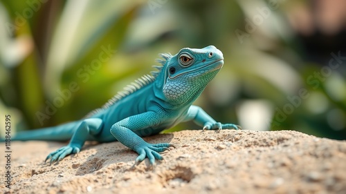 Fototapeta premium Turquoise Iguana on Stone, Closeup, Vivid Colors, Sharp Focus