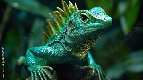 © SellRise, Fototapeta premium Turquoise lizard perched on rock, lush foliage background; nature photography