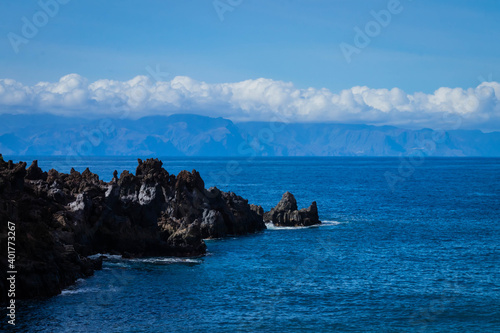 © Magdalena, Naklejka premium turquoise ocean breaking waves against beach and black rocks on a beautiful sunny day