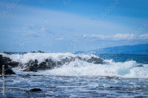 © Magdalena, Fototapeta premium turquoise ocean breaking waves against black beach and black rocks on a beautiful sunny day