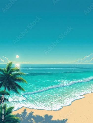 © Anat art, Fototapeta premium Turquoise Ocean Meets Sandy Beach With Palm Silhouettes Under Golden Sunlight on a Clear Horizon