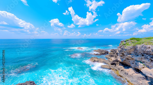 Fototapeta premium Turquoise ocean waves crashing on rocky coast under sunny sky
