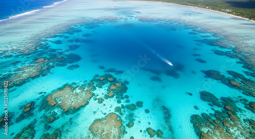 © DEDI, Fototapeta premium Turquoise Paradise Boat Glides Across the Clear Tropical Lagoon Waters