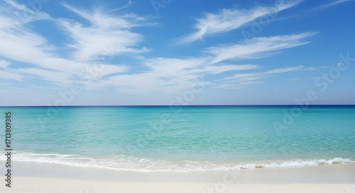 Obraz premium Turquoise Sea Water and White Sand Beach Under Blue Sky with Wispy Clouds in Summer