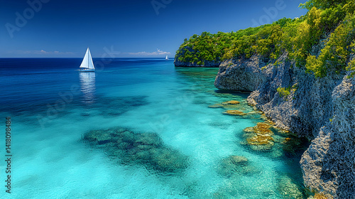 © Ahmad, Fototapeta premium Turquoise sea waters meet rocky cliffs with lush vegetation under a vibrant blue sky featuring sailboats sailing along