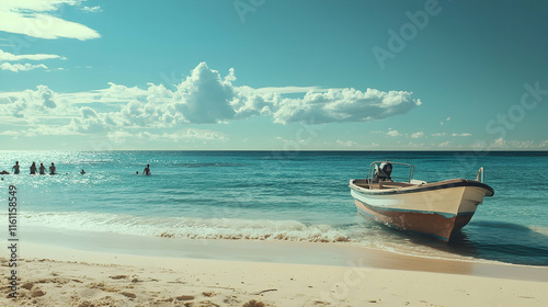© edo, Naklejka premium Turquoise sea with a small boat resting on the sandy beach and people swimming near the shore under a bright blue sky with scattered clouds