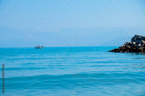 Fototapeta premium turquoise sea with dark rocks against the blue sky with a small white boat in the background