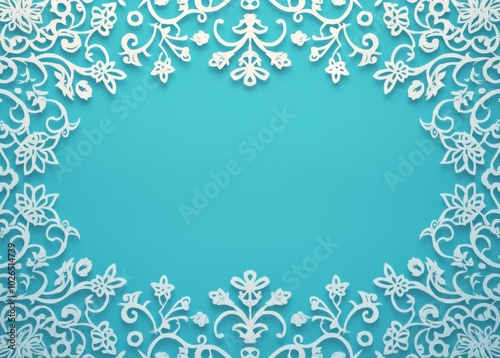 © kkkiim graphic, Fototapeta premium Turquoise Teal Green Mexican Paper-Cut Card with Decorative Border and Blank Space for Writing on a White Background.