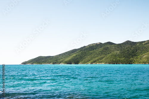 Fototapeta premium Turquoise waters meet lush green hills under a clear blue sky on a serene...
