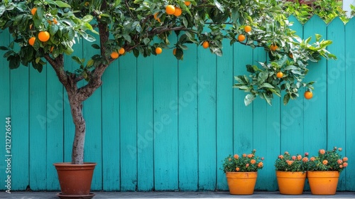 © AImmersive Imagery, Obraz premium Turquoise Wooden Fence with Orange Tree and Flower Pots for Vibrant Outdoor Landscaping Design in Urban Setting