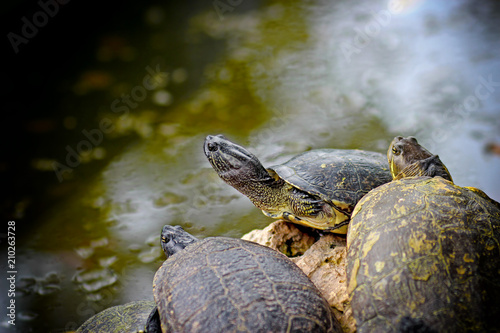 Fototapeta premium Turstles on the stones over the water, they are basking in Boca de Guama, Cuba