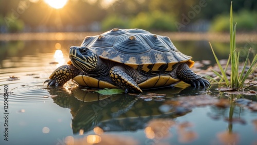 Fototapeta premium Turtle basking by a serene pond at sunrise with reflections and gentle...