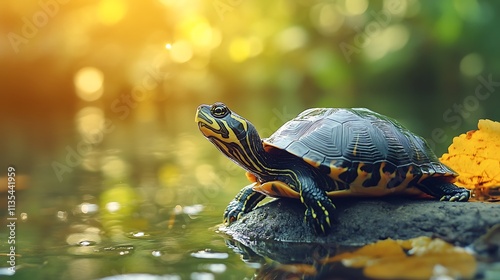 Obraz premium Turtle basking in the sunlight. Concept of peace, tranquility, and nature.