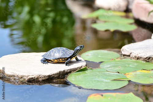© pavlofox, Obraz premium Turtle basking on a rock by a serene pond surrounded by lush lily pads and still water on a sunny day in nature