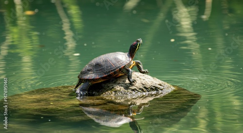© Cortex, Fototapeta premium Turtle basking on a rock in a pond