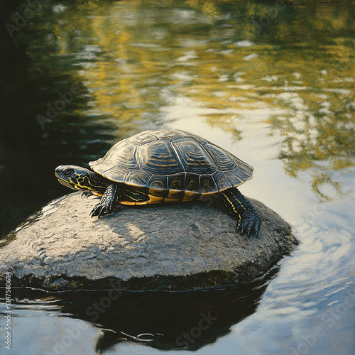 Fototapeta premium Turtle basking on a rock in a tranquil pond