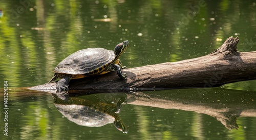 Fototapeta premium Turtle Basking on Log by Pond - A turtle rests on a log in a calm pond, symbolizing peace, nature, stillness, resilience, and wildlife