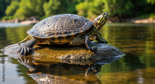 © Musarrof, Obraz premium Turtle basking on rock in serene lake with green trees