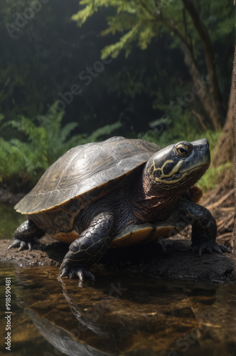 © DavidMohn, Obraz premium Turtle by the Water in Lush Greenery