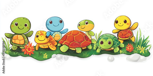 © Isaiah, Obraz premium turtle cartoon animal cute kids nature graphics illustration green playful friendly beach shell character colorful reptiles pond water fun sea