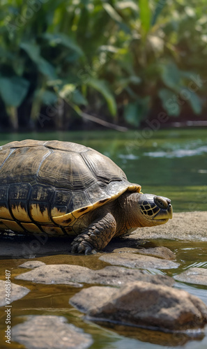Fototapeta premium turtle crawling leisurely by the pond