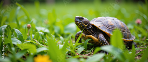 Fototapeta premium Turtle crawling through lush green grass, exuding a calm and serene feeling...
