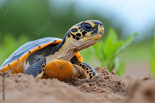 © Sanchai, Obraz premium Turtle digging a nest in the soft sand, preparing for the next generation as it follows its natural instincts