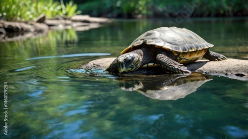 © Rahmat, Fototapeta premium Turtle drinking water by a riverbank